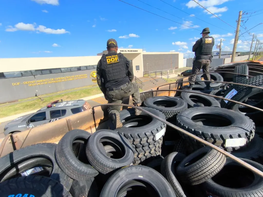 Uma operação realizada pelo Departamento de Operações de Fronteira (DOF) resultou na apreensão de uma carreta da marca Iveco, carregada com 165 pneus de diferentes tamanhos. A ocorrência se deu na manhã de hoje no distrito de Vista Alegre, em Maracaju, durante um patrulhamento na rodovia MS-164.
