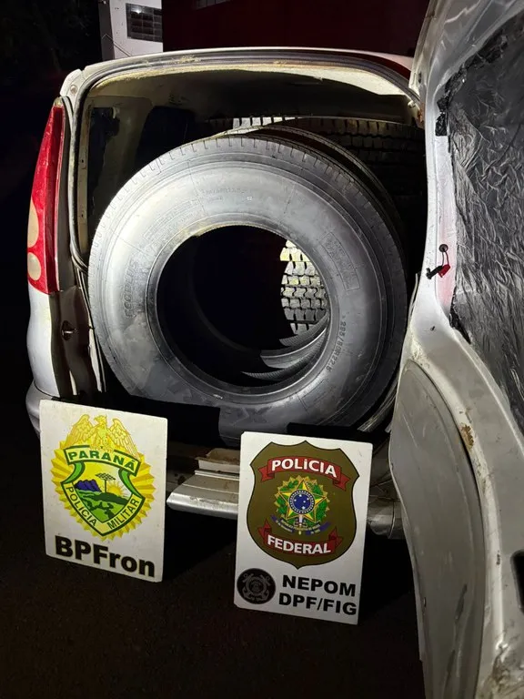 Os policiais pararam um veículo Toyota Etios e, ao examiná-lo, notaram que o banco traseiro estava carregado com diversos pneus. Em uma inspeção mais minuciosa, foram descobertas cinco caixas de cigarros importados e cerca de dez pneus dispostos de forma irregular no interior do carro.